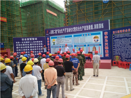 6月16日上午,安全管理部組織、信訪保衛(wèi)部及后勤綜合服務(wù)部協(xié)同在五分公司固鎮(zhèn)名邦國(guó)際花都項(xiàng)目開展6.16安全咨詢?nèi)铡踩?、簽名、?yīng)急救援演練、職工體檢、安全主題宣講、安全生產(chǎn)經(jīng)驗(yàn)交流、安全教育場(chǎng)館體驗(yàn)、安全宣傳圖牌展覽等一系列“安全生產(chǎn)月”宣傳教育活動(dòng),分管安全副總經(jīng)理葉和永任總指揮,項(xiàng)目部全體管理人員及工人共一百余人參加。